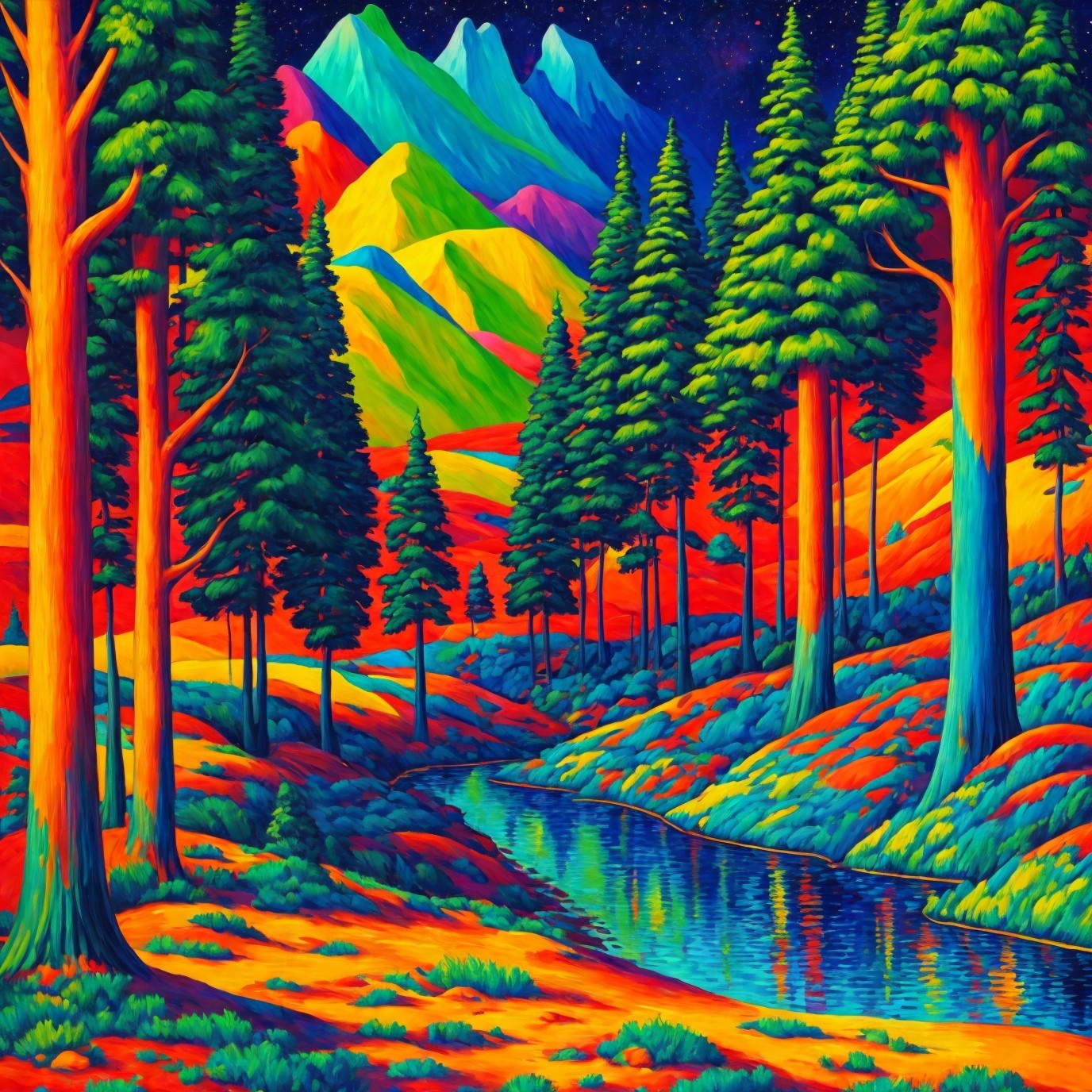A vibrant, impressionistic painting of a forest with tall trees, a flowing stream, colorful flowers, and a cozy house amidst the woods.