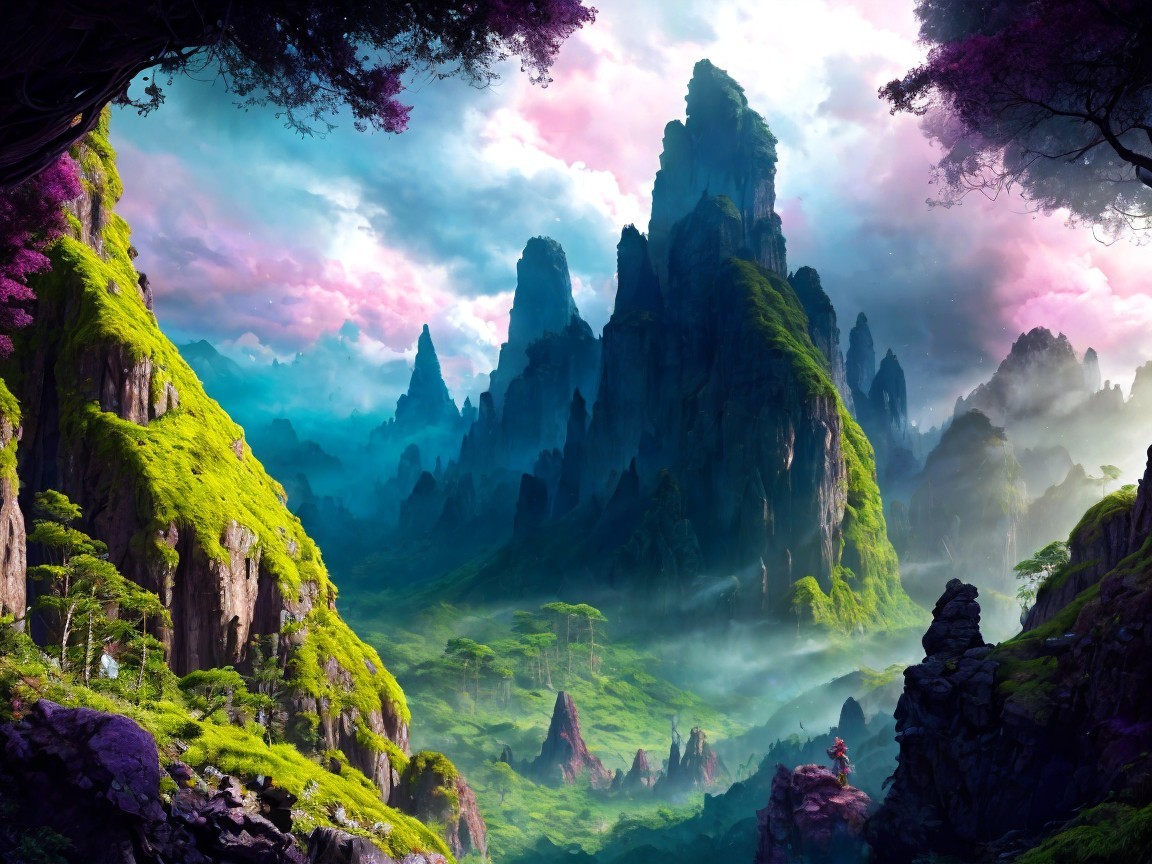 A breathtaking landscape featuring towering mountains covered in lush greenery. Mist shrouds the valleys, while vibrant pink clouds create a dreamy atmosphere, evoking a sense of wonder.