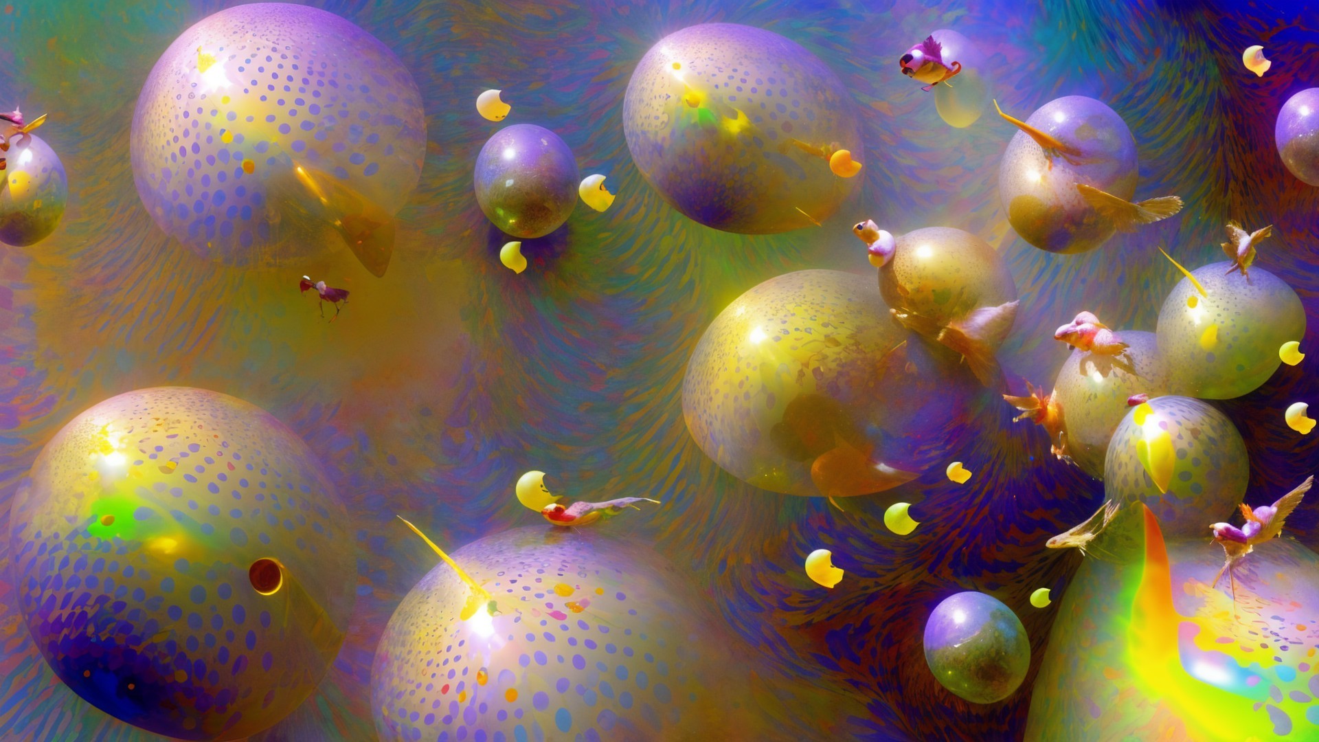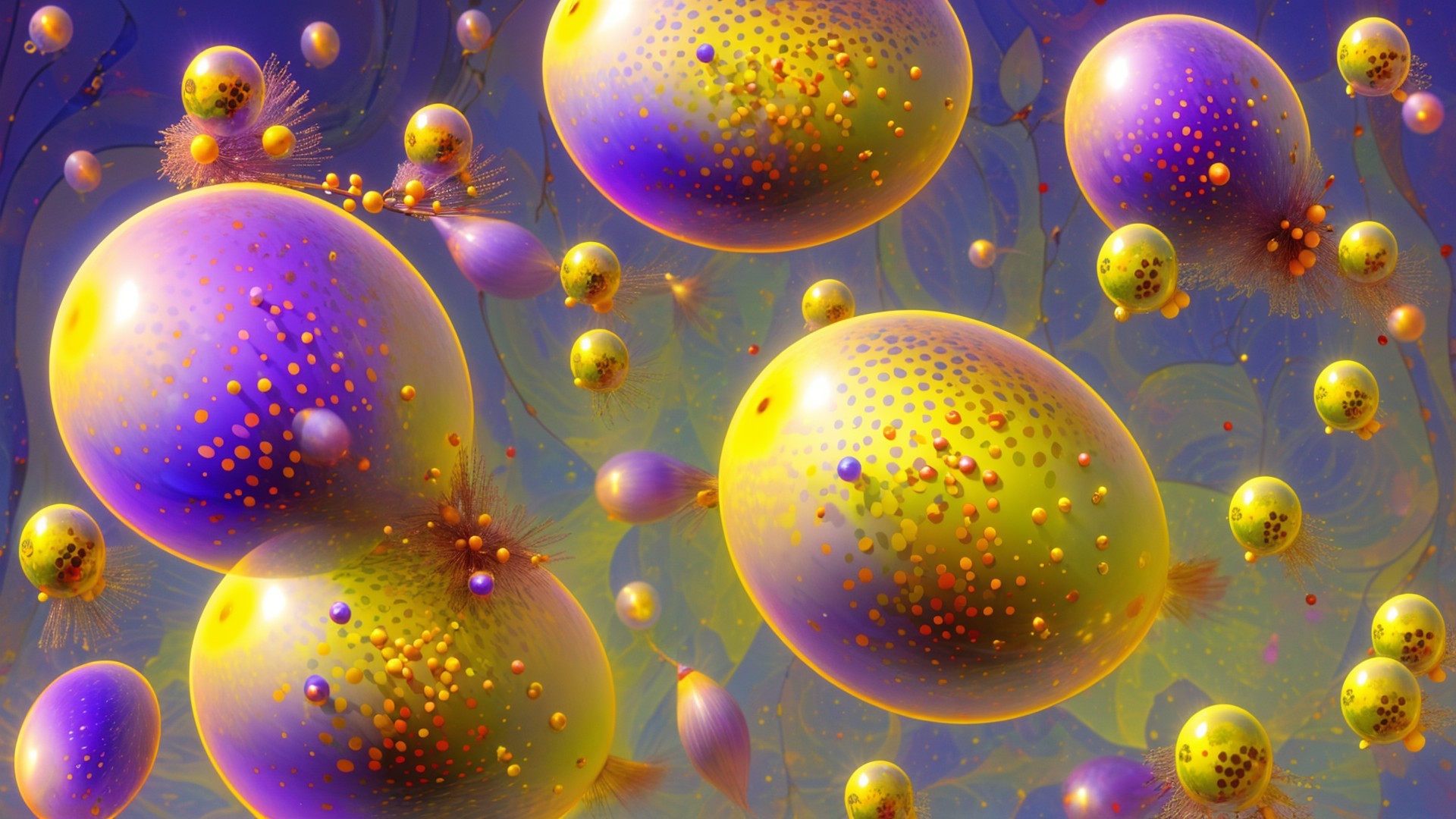 A vibrant, abstract scene filled with colorful spheres and organic shapes, undulating in a surreal landscape of blended purples, oranges, and blues, evoking a dynamic microscopic world.