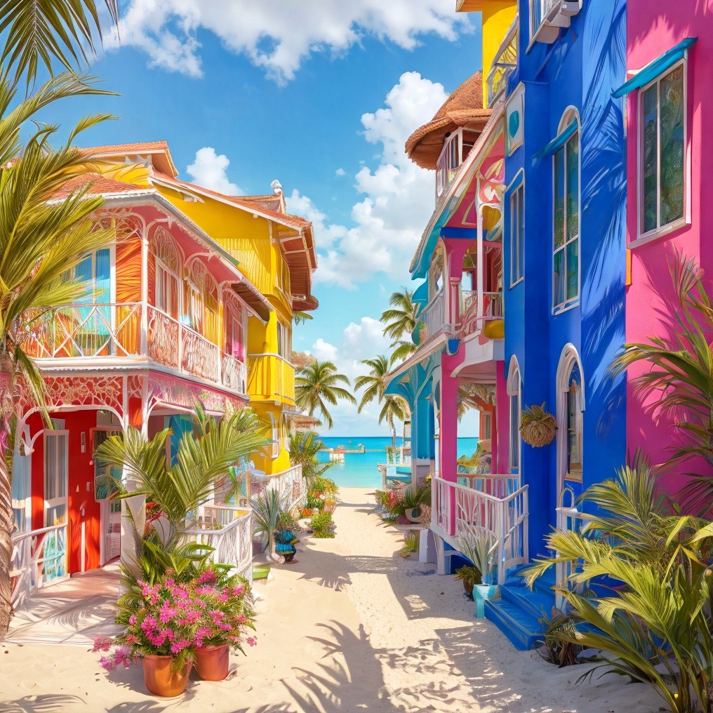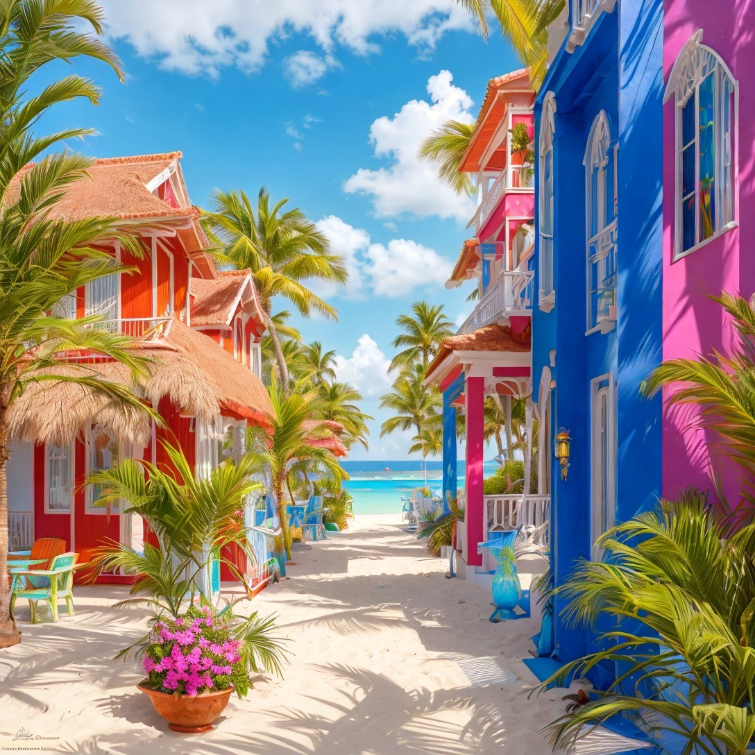 Vibrant, colorful buildings flank a sandy path leading to a serene beach, framed by lush palms and clear blue skies.