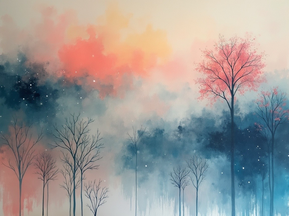 A dreamy landscape featuring trees in soft hues of pink, orange, and blue. The misty background enhances the tranquil, ethereal atmosphere of the serene forest scene.