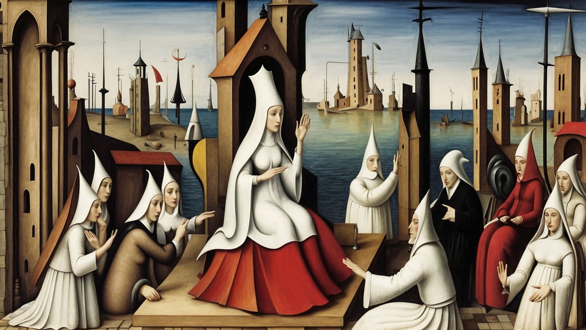 A serene scene by the water features a woman in a red dress sitting on rocks, surrounded by five others in flowing, muted robes. Towering stone buildings enhance the mystical atmosphere.