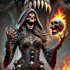 A skeleton sorceress in an ornate outfit stands amidst ancient ruins, casting fiery magic. A dragon-like creature by her side adds to the enchanting yet menacing atmosphere.
