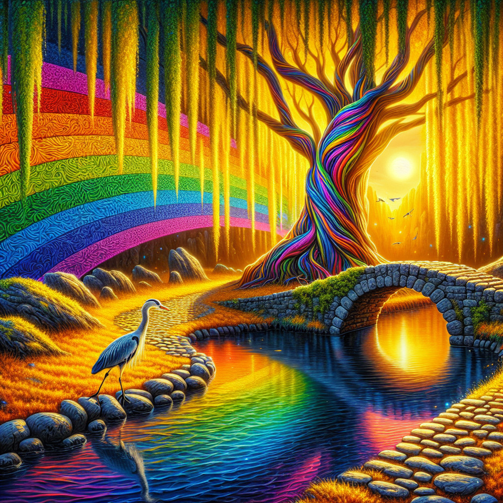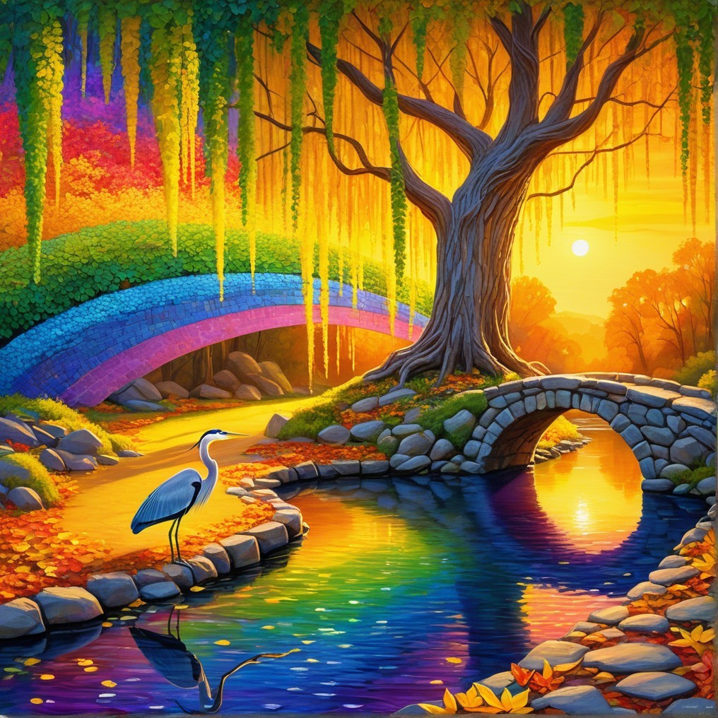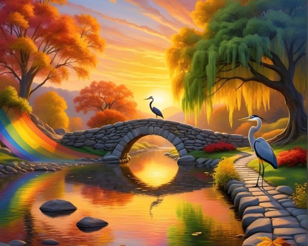 A vibrant landscape features a majestic tree beside a serene pond, with autumn leaves in hues of orange and gold. A graceful heron stands near a stone bridge, under a radiant rainbow and sunset glow.