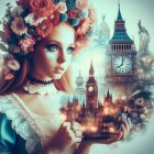 A young woman in a pastel blue dress adorned with roses holds colorful desserts, set against a charming European cityscape. Her whimsical look captures a playful, fairytale vibe.