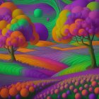 A vibrant, surreal landscape features whimsical trees with colorful spheres, rolling hills in shades of purple and orange, and a swirling sky that creates a dreamlike atmosphere.