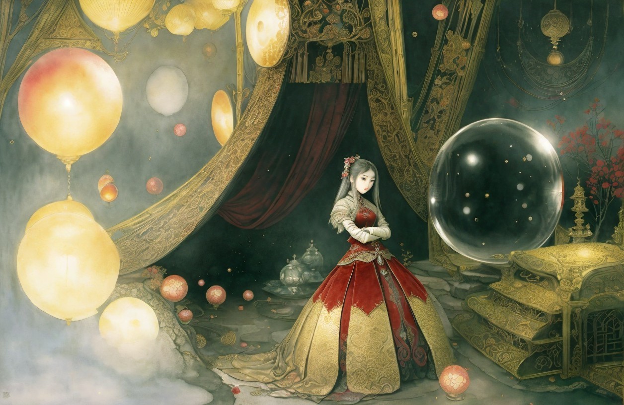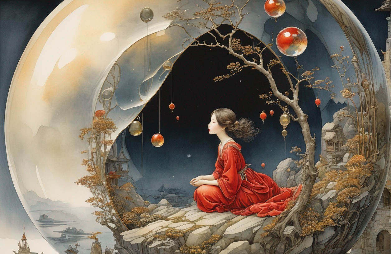 Beauty girl in a bubble,, Medieval Japanese Artists Sumi-e Style, choral, Ruby red, Velvet Black, Shabby, Dull Gold, Amber Gray, Golden Ratio, Surreal Fantasy, Elegant, High Definition Ultra Fine 3D Line, Zenangle Style, Watercolor Patchwork , Arthur Rackham Style, Paul Kidby, , Jacek yerka, Extremely Detailed, Intricate, Thoughtful, HDR, Fractal, Beautiful, Award Winning, Fantasy Look, Fantasy, Crisp Quality