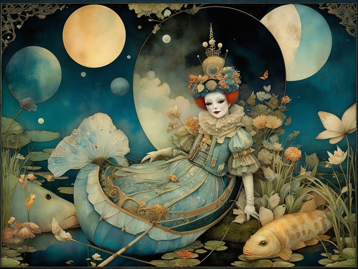 A majestic figure in ornate golden attire stands before a fantastical landscape, featuring shimmering planets, a luminous castle, and a mystical egg, all under a cosmic sky.