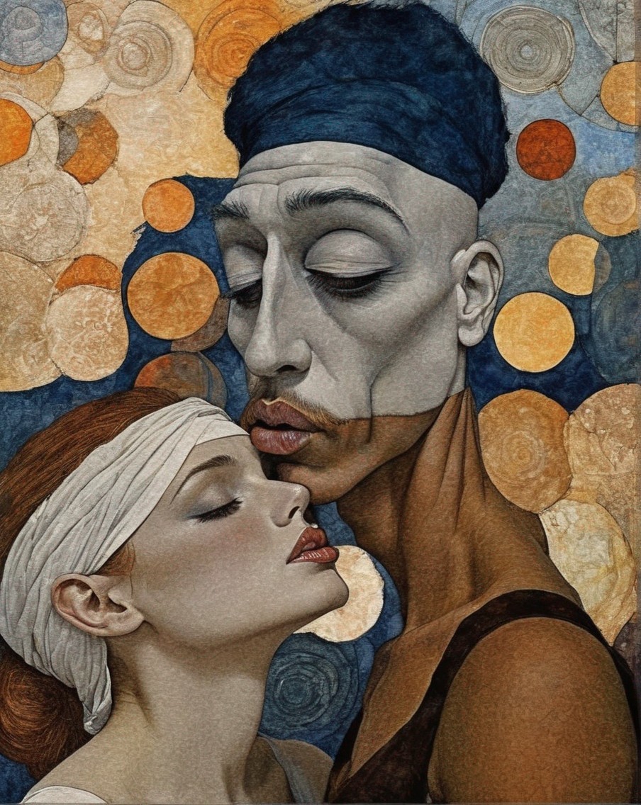 An artwork depicting a tender moment between a man and woman with a stylized, mosaic background.