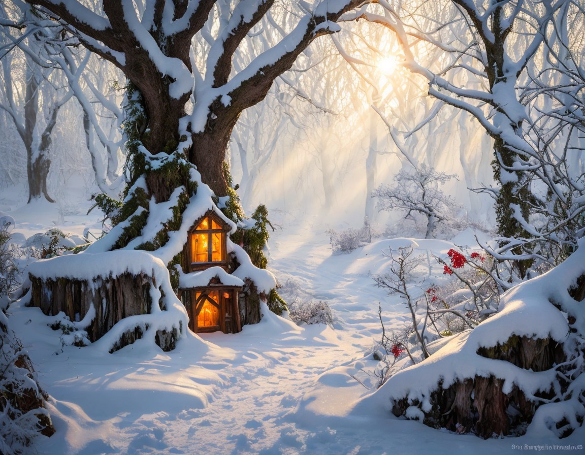 an enchanting messy cozy frosty magical mystical fantasy witch forest glade in winter, snow, fairy tale, misty sun rays, vines, old oak tree, an old broom, various kinds of winter herbs under snow, magical potion bottles, volumetric lighting, oil painting, beautiful, masterpiece, cool blues and whites, red and gold colors, cozy, perfect, masterpiece