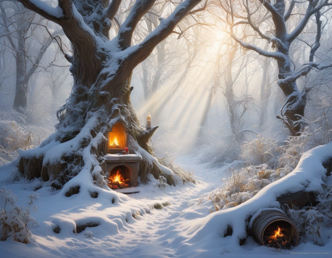 Prompt: an enchanting messy cozy frosty magical mystical fantasy witch forest glade in winter, snow, fairy tale, misty sun rays, vines, old oak tree, an old broom, various kinds of winter herbs under snow, magical potion bottles, volumetric lighting, oil painting, beautiful, masterpiece, cool blues and whites, red and gold colors, cozy, perfect, masterpiece