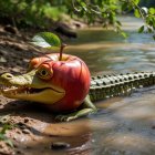 Prompt: surreal apple with a stem and two green leaves rests on muddy riverbank soil. Its front features a crocodile snout and teeth without eyes. The back extends into a scaled green crocodile tail without legs, curving toward the water's edge. Shallow river currents flow past foreground reeds. Dappled sunlight filters through overhanging tree branches onto the scene.