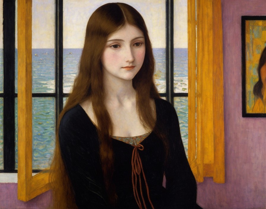 An oil painting of a young woman with long auburn hair by a window overlooking the sea, with a sailboat in the distance.