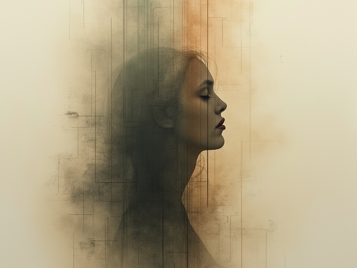 The image features a stylized portrait of a woman with a serene expression, her silhouette softly defined by delicate, abstract lines that evoke a sense of ethereal beauty and mystery.