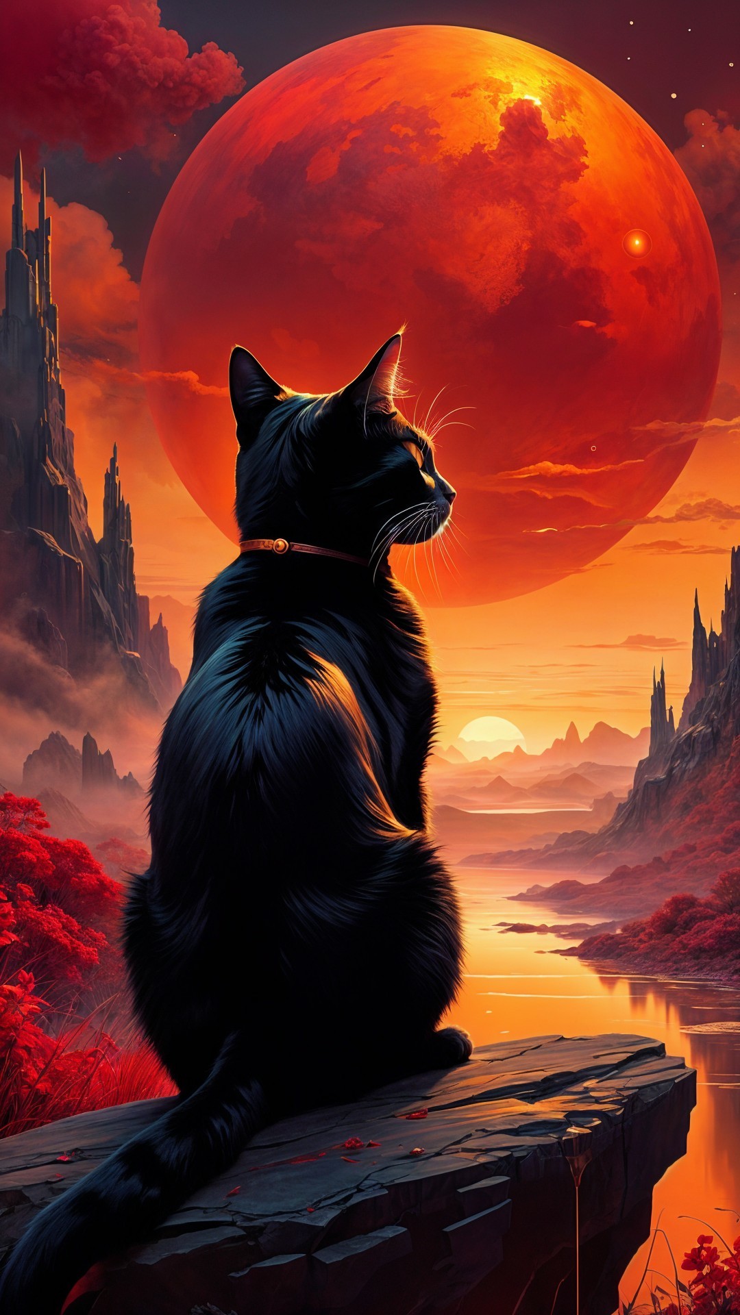 A majestic black cat sits on a rocky ledge, gazing at a vibrant, red planet rising above a surreal landscape of towering cliffs and fiery skies, surrounded by vivid red foliage.