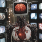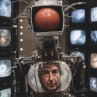 The image features a humanoid robot who took keep your eye on the ball too literally, surrounded by vintage television screens displaying cosmic imagery and abstract patterns.