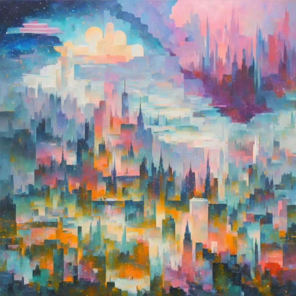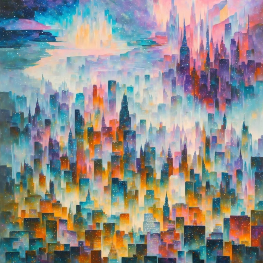 Colorful Abstract Cityscape Painting with Setting Sun in Purple, Orange, and Blue