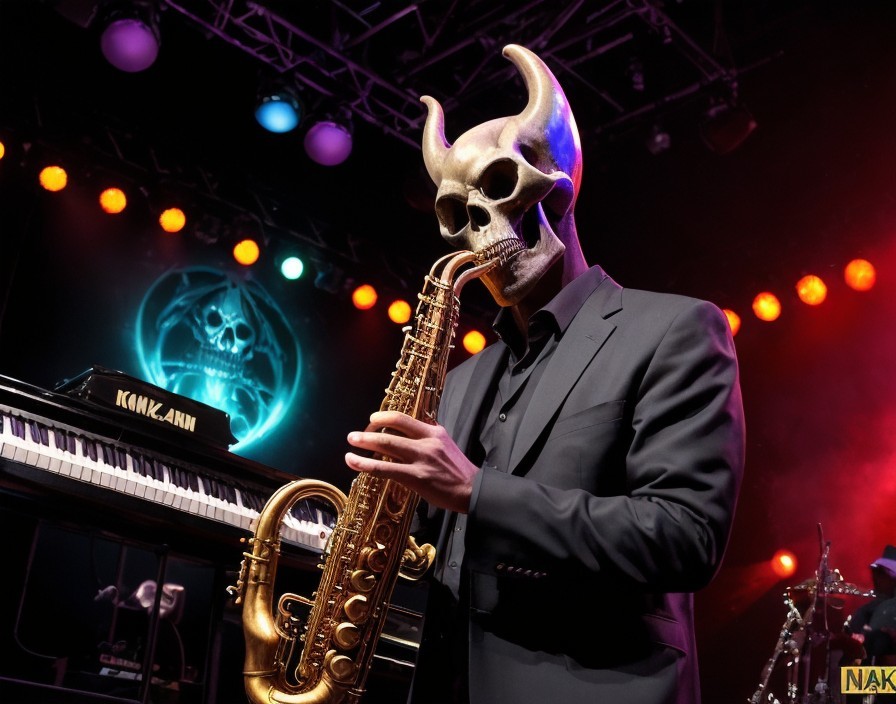 Prompt: Jazz musician on stage, monstrous, alien skull head, normal human body, carrying a distorted saxophone, other human jazz musicians in background. Frightening, devil worship, pentagram. Highly detailed, subdued colours like a smoky club.
