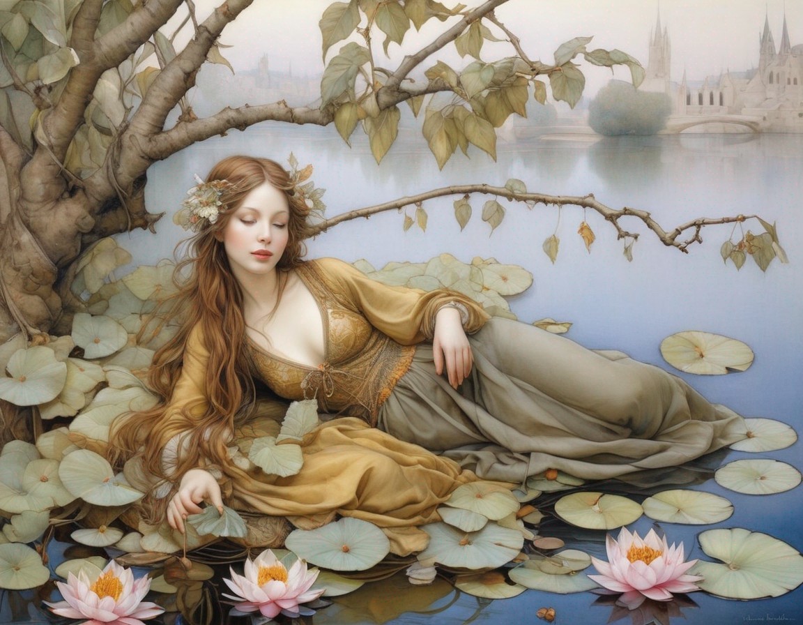 A woman with a serene expression sits in a tree, adorned with leaves and wearing a golden dress, blending with a mystical, dreamy background.