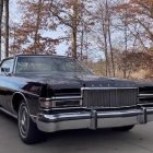 A classic black 1974 Mercury Marquis Brougham with a polished chrome front and sleek lines, parked on a scenic road bordered by tall trees and open fields, showcasing its vintage charm and elegance.