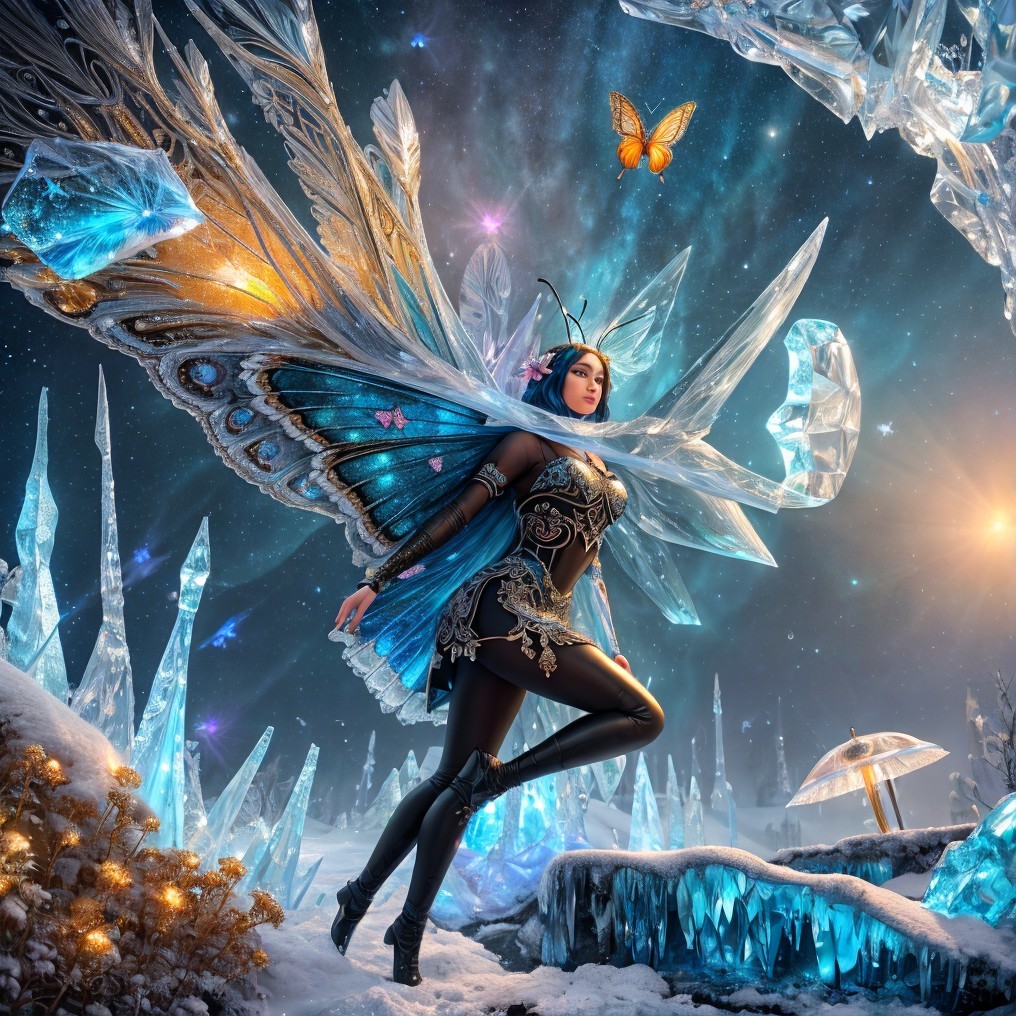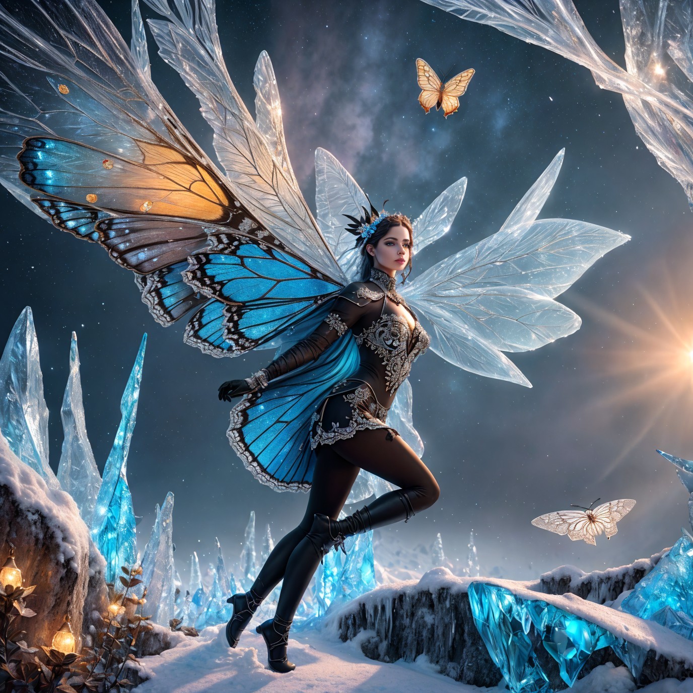 A mystical figure with vibrant butterfly wings stands in a magical landscape, surrounded by glowing flowers and ethereal light, as butterflies flutter around her in a whimsical scene.