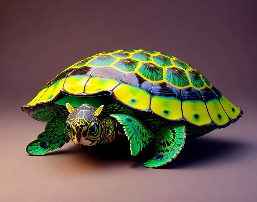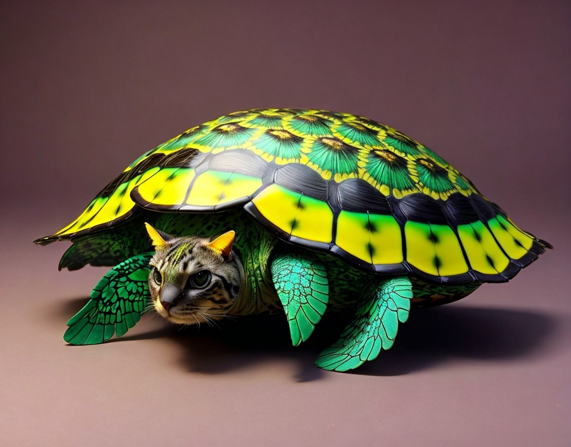 A cat with a turtle shell overlay, creating a whimsical hybrid creature, against a brown backdrop.
