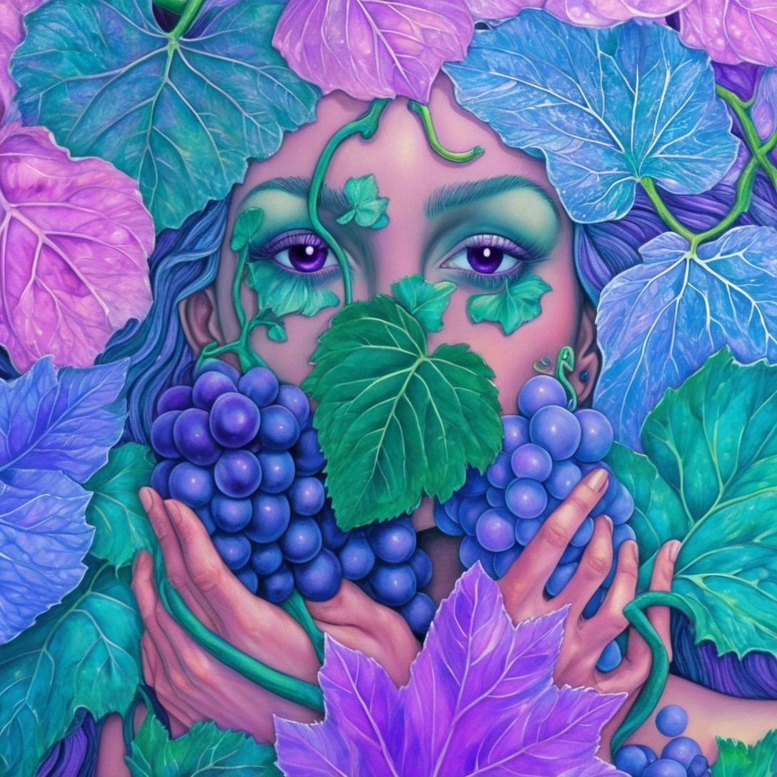 A vibrant, surreal artwork features a woman partially obscured by leaves and grapes, merging nature and femininity in rich purples and greens, evoking a sense of mystique and abundance.