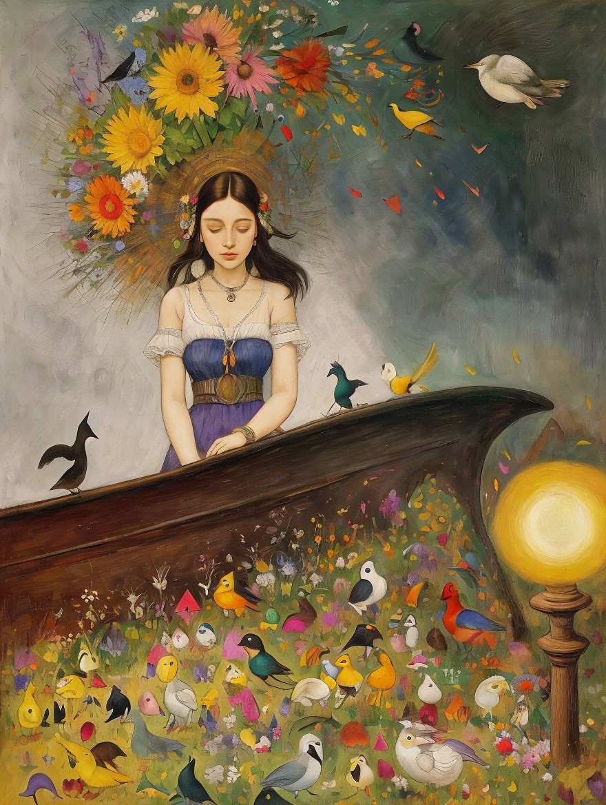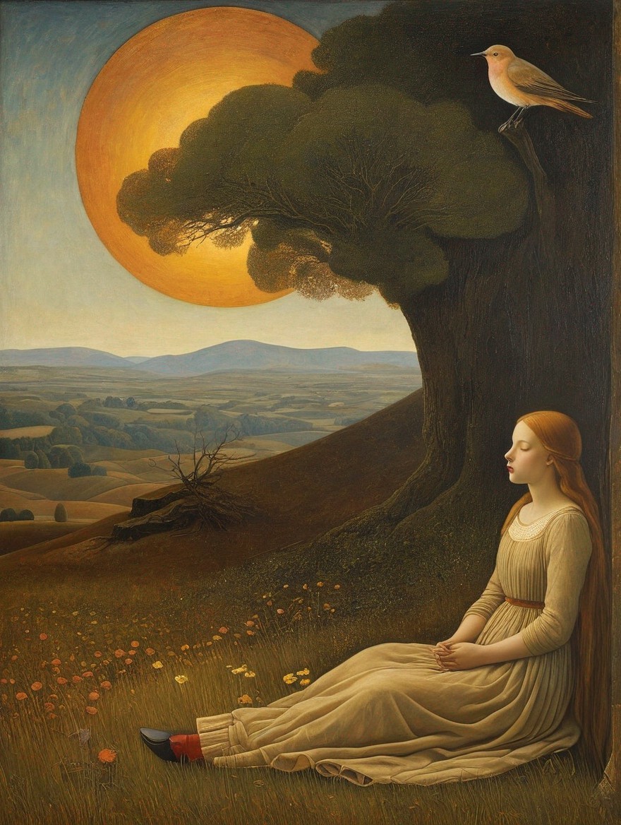 A surreal painting of a woman in a striped dress gazing at a flying bird against a backdrop of rolling hills and a large moon.