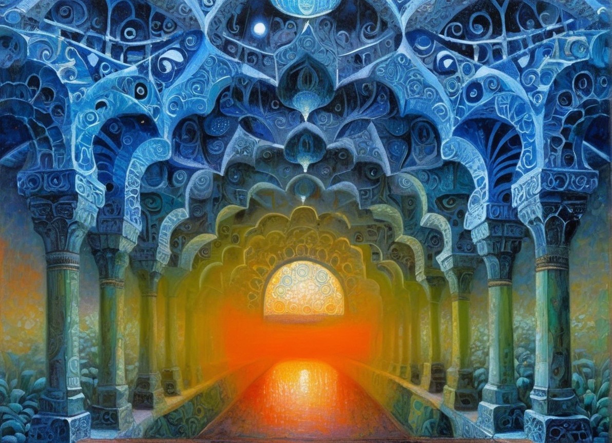 View into a long corridor, many oriental columns and arches, at the end of the path a bright light as if from a late sunset, Stunning color oil drawing on textured paper, Abstract expressionism, surrealism, colorful shapes, dreamlike atmosphere, complex stipple texture, Style: Friedensreich Hundertwasser and Edward Gorey, Tomasz Setowski, detailed illustration, rich colors, intricate patterns, imaginative design, fantasy setting, otherworldly ambiance, patchwork style of Masamune Shirow, Catrin Welz-Stein, Satoshi Kon and Van Gogh, Mamoru Nagano