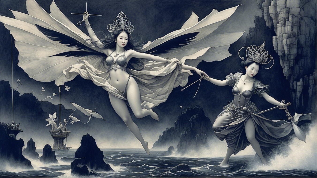 A serene figure with butterfly wings sits elegantly, adorned in a flowing gown and a crown. Surrounded by white rabbits and other animals, she embodies grace and majesty in a fantastical setting.