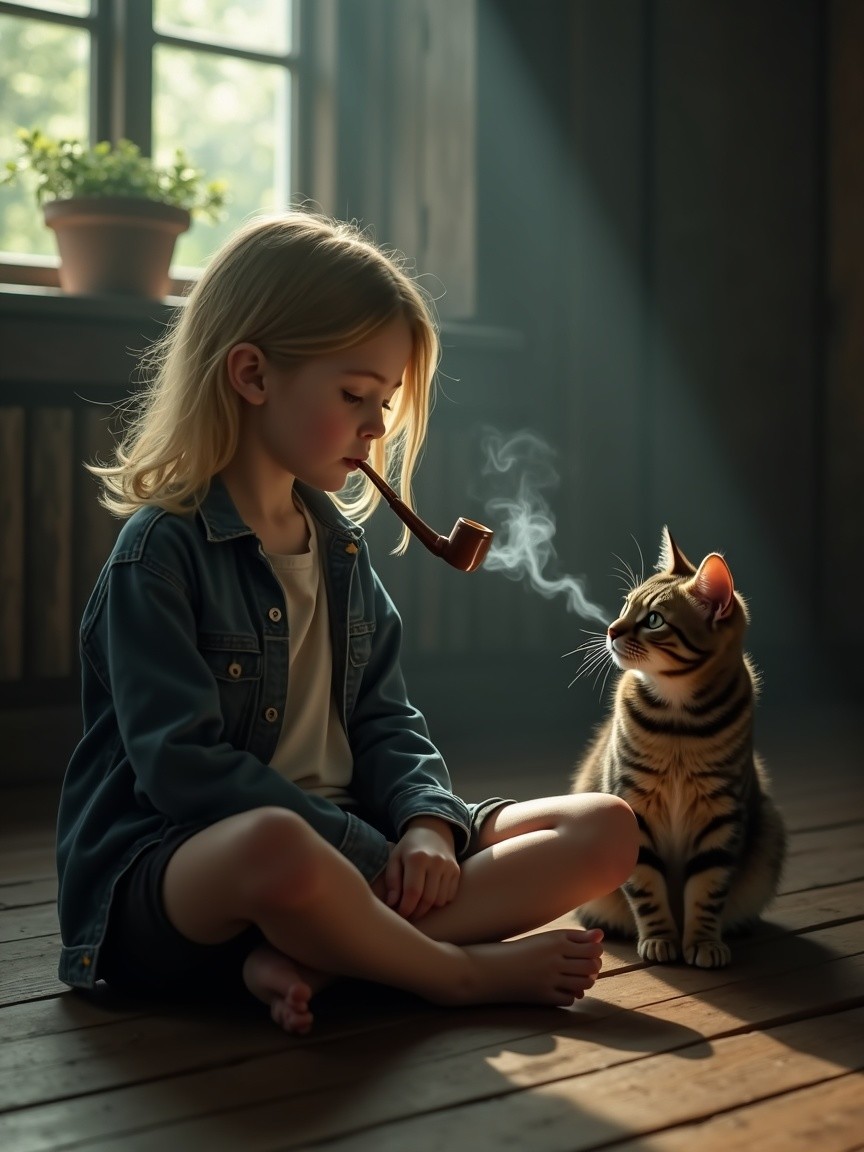 A young child with flowing hair sits cross-legged on a wooden floor, puffing on a pipe, while a curious striped cat watches, bathed in soft sunlight filtering through a window.