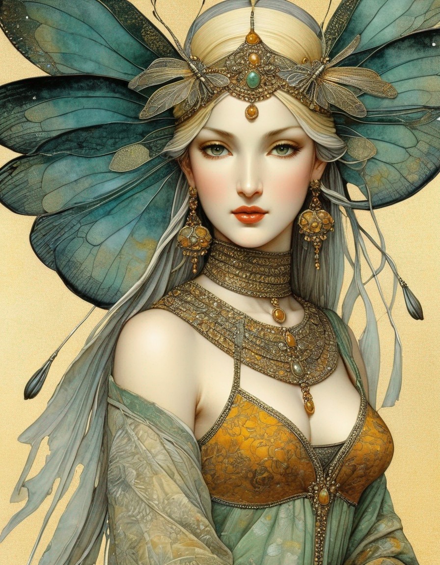 + Prompt:Melissae. Nymph of dragonflies. 3rd century Persian miniature art, golden ochre, silver, sage green, dark yellow, paprika, Velvet Black, Shabby, Dull Gold, Amber Gray, Golden Ratio, Surreal Fantasy, Elegant, High Definition Ultra Fine 3D Line, Zenangle Style, Watercolor Patchwork , Arthur Rackham Style, Paul Kidby, , Jacek yerka, Extremely Detailed, Intricate, Thoughtful, HDR, Fractal, Beautiful, Award Winning, Fantasy Look, Fantasy, Crisp Quality