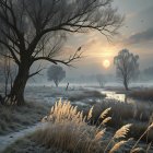 A serene winter landscape features a misty river surrounded by frosted trees and tall grasses. A soft sunrise casts a warm glow over the tranquil scene, enhancing the ethereal atmosphere.
