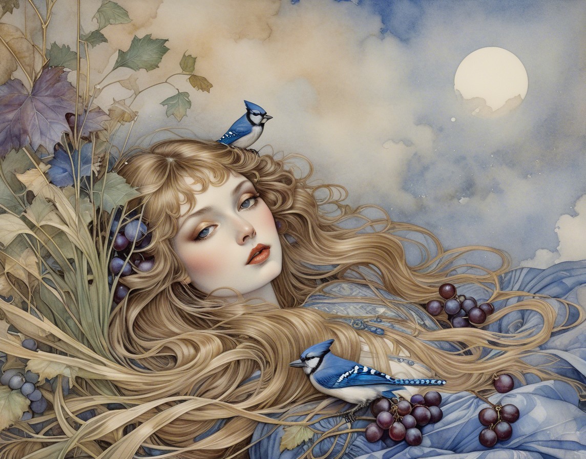 A serene woman with flowing hair adorned with blue jay birds and grapevines, set against a soft moonlit sky. The scene blends nature and fantasy in exquisite detail and color.