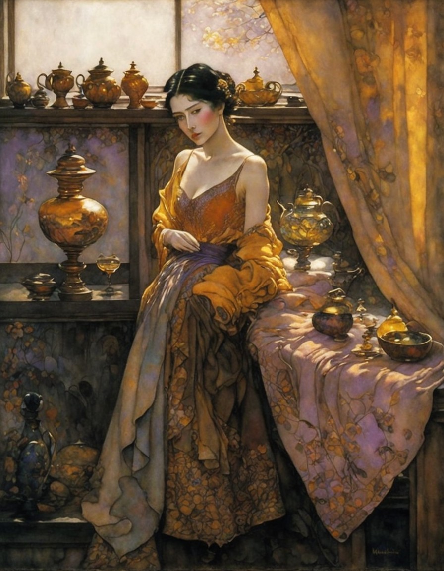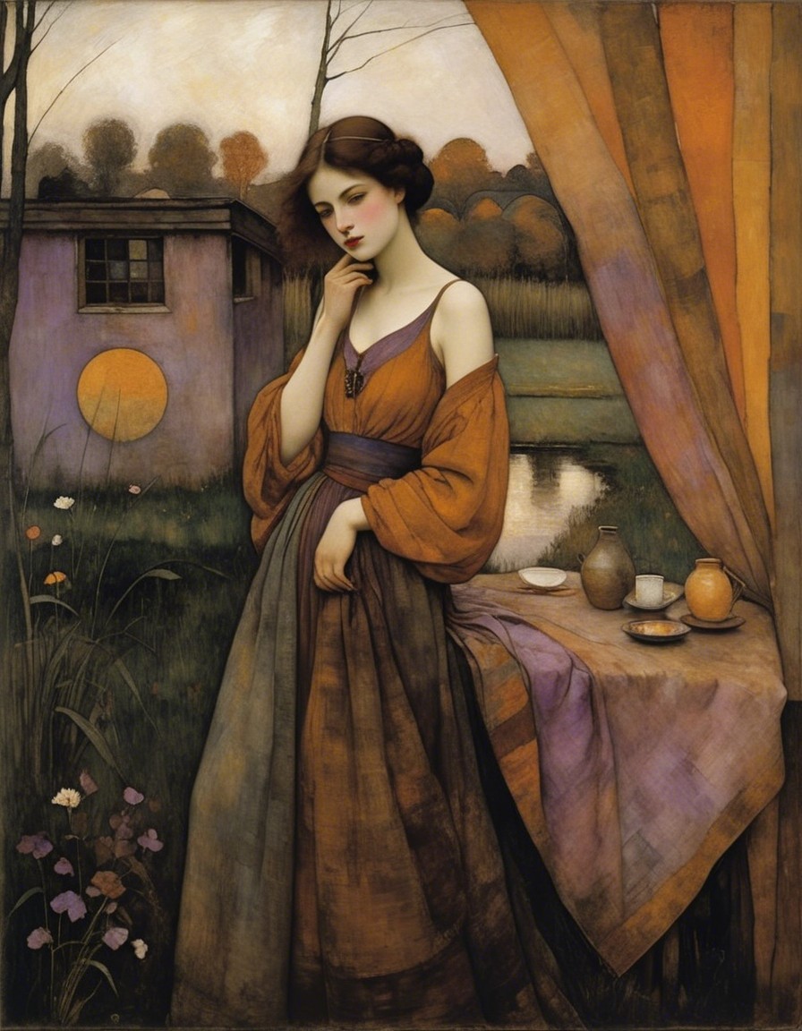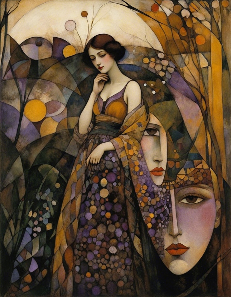 A stylized woman in a flowing dress stands pensively against a landscape of mountains and fields, blending warm tones and geometric shapes, with an abstract face subtly integrated into the scene.