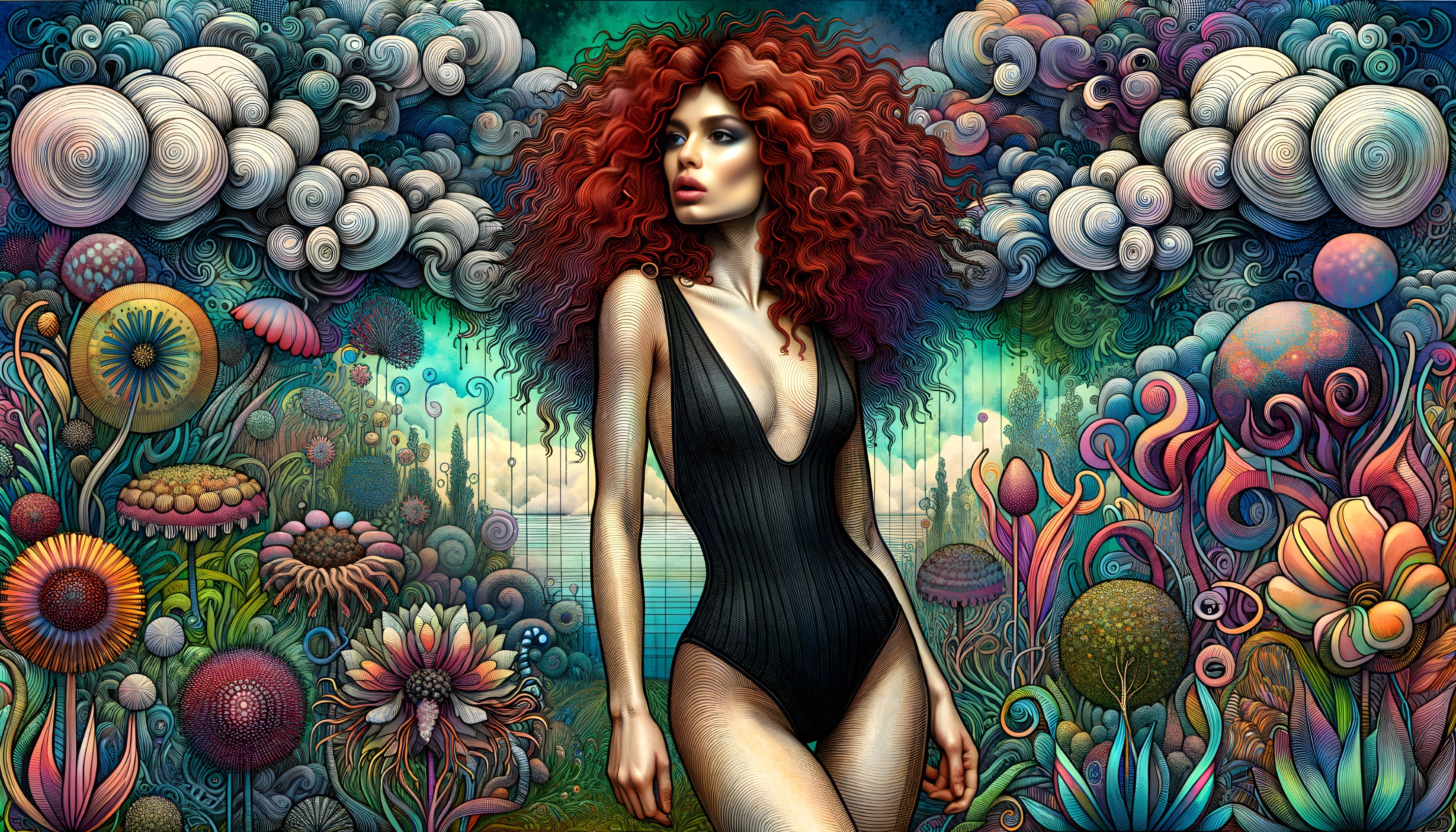 A vibrant artwork depicting a woman with red hair in a surreal, colorful garden with intricate flowers and cloud-like formations.