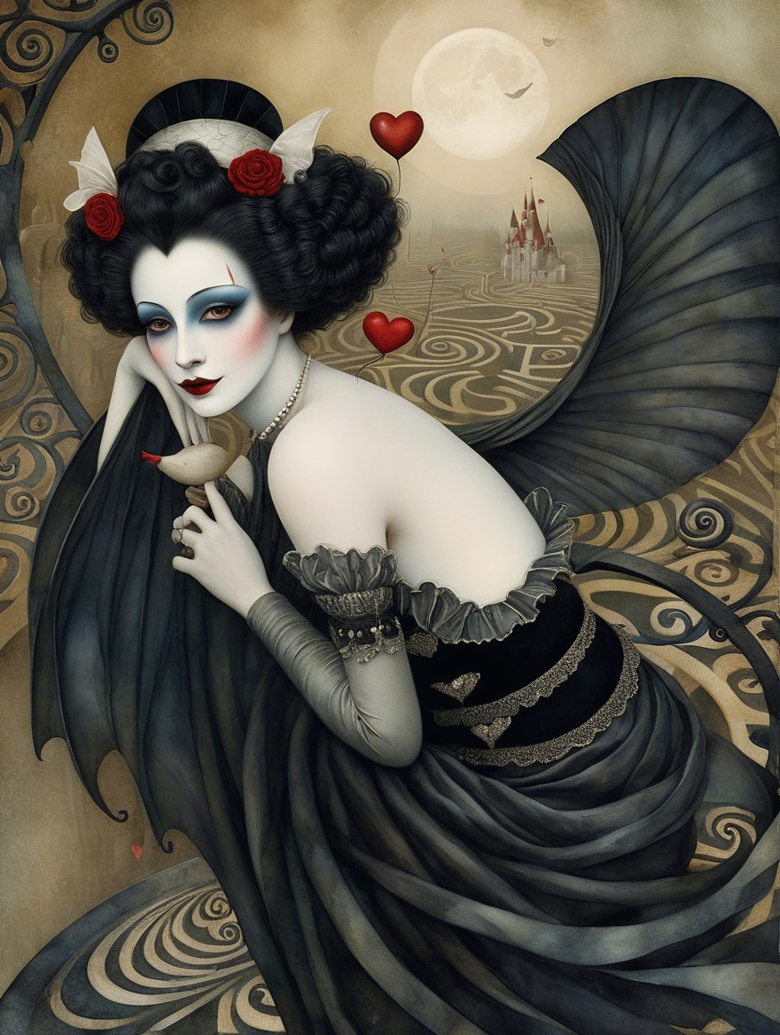 A mystical figure with striking features and dark attire poses gracefully, holding a small bird. The backdrop features swirling patterns, a full moon, and a distant castle, creating an enchanting atmosphere.
