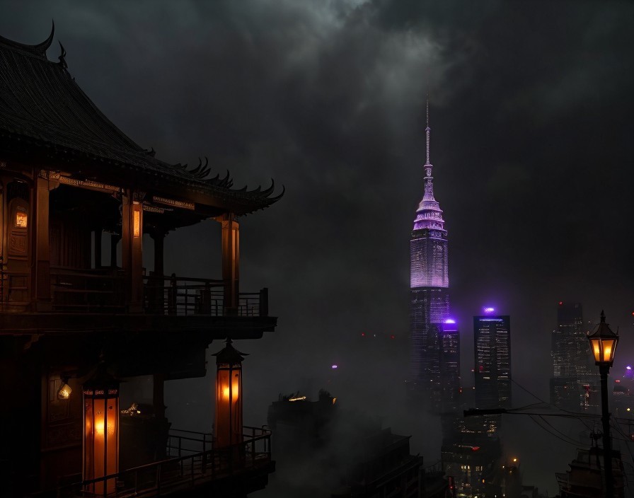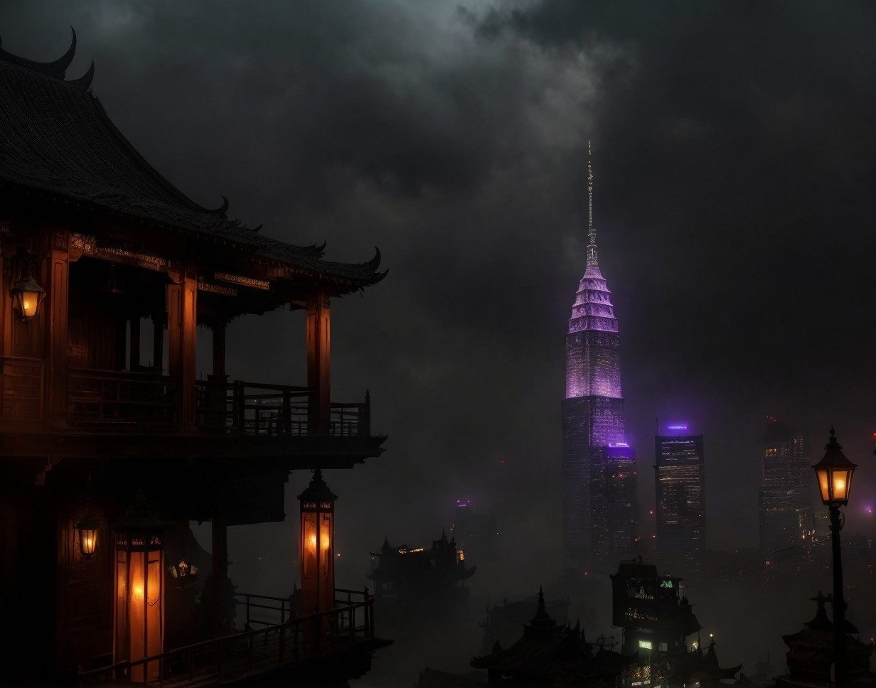 A dramatic skyline features a towering skyscraper illuminated in purple against a stormy night sky. Traditional architecture in the foreground adds a mystical contrast to the modern cityscape.
