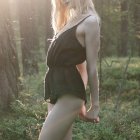 A young woman stands gracefully in a sunlit forest, wearing a flowing black outfit. Her long hair cascades down, adorned with a floral crown, blending harmoniously with the natural surroundings.