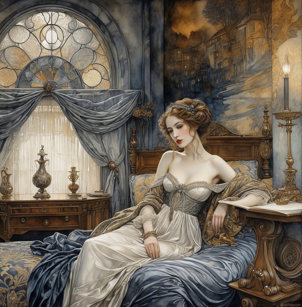 A serene woman in a flowing gown lounges elegantly on a bed in an ornate room. Soft light filters through an intricately designed window, illuminating her graceful pose and the decor.