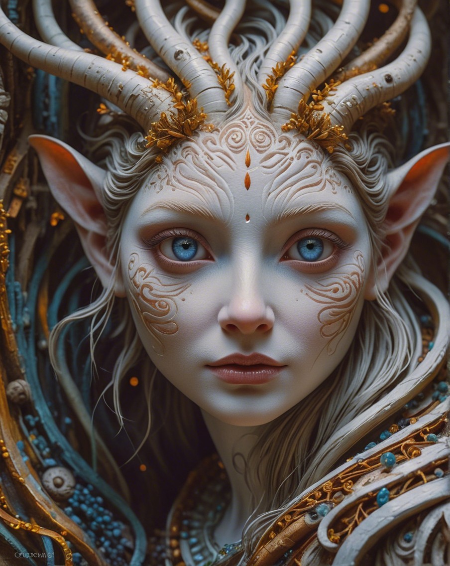 A fantastical portrait of a striking figure with intricate designs on her face, long flowing hair, and elegant horns. Her expressive blue eyes convey a blend of mystery and serenity.