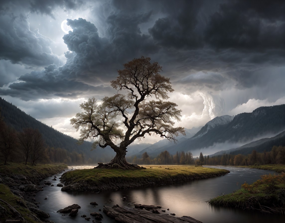 Natural portal, Epic cinematic breathtaking intricate insanely detailed painting of dramatic storm clouds, dark night and bright moonlight glow on an aesthetic remarkable old white oak tree, river, winding path, mountains, by tomasz allen kopera, dariusz zawadzki, andreja peklar, ivan shiskin, beautiful, colorful, cosmic, ultra detailed, ultra realistic, a masterpiece, polished, crisp quality, no frame