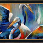 The artwork features two whimsical pigs emerging from swirling abstract shapes in blue and gold. The vibrant colors and smooth curves create a playful and imaginative scene.