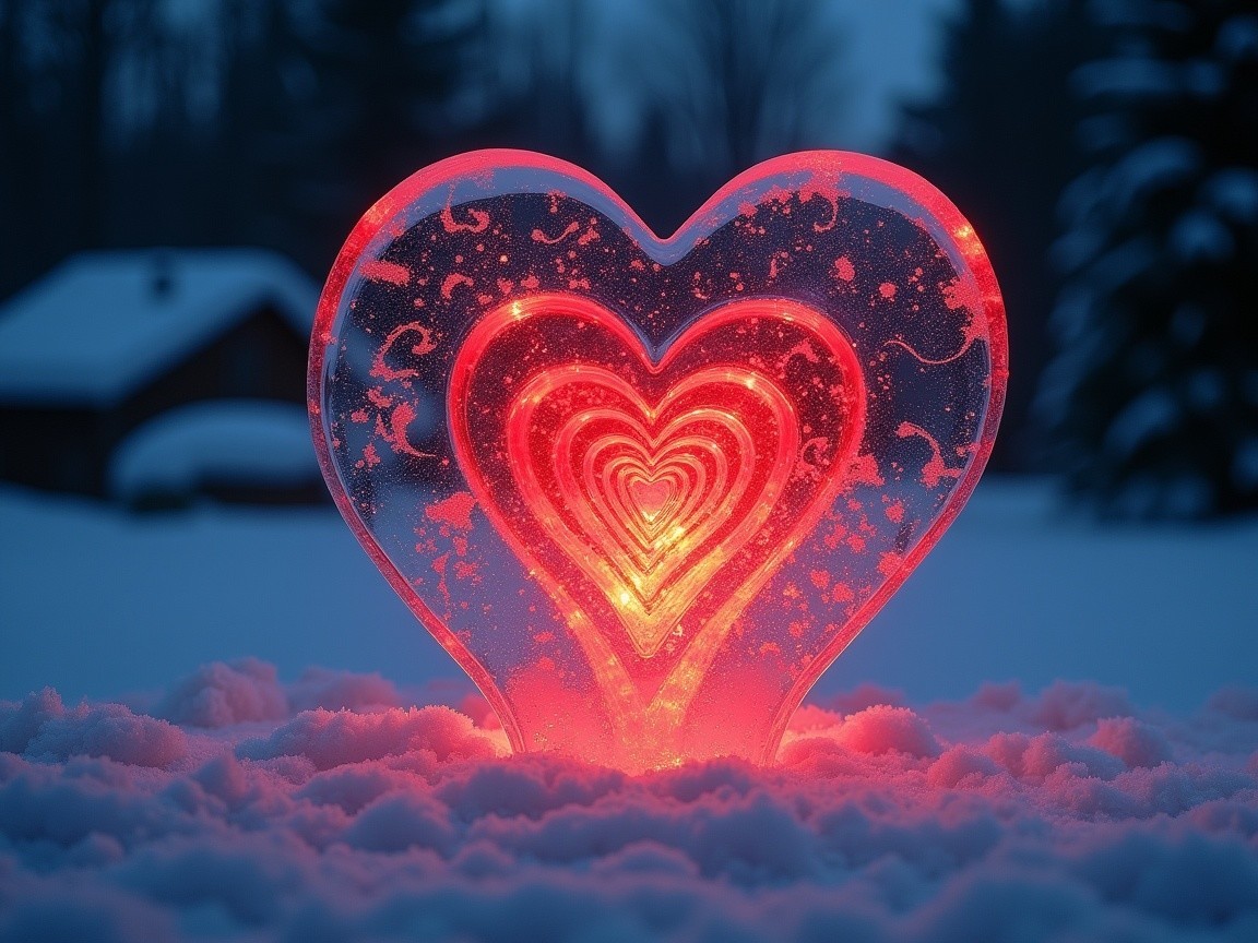 An illuminated ice sculpture of a heart, featuring intricate floral designs, glows warmly in a snowy landscape, surrounded by trees and a cozy cabin in the background.