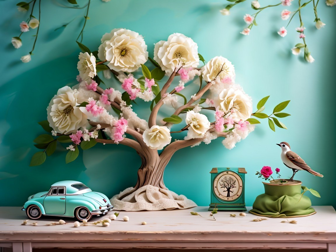 A whimsical scene featuring a large, textured tree with fluffy white foliage, a clock nestled within its branches, and two vintage cars at its base, surrounded by small birds and floral accents.
