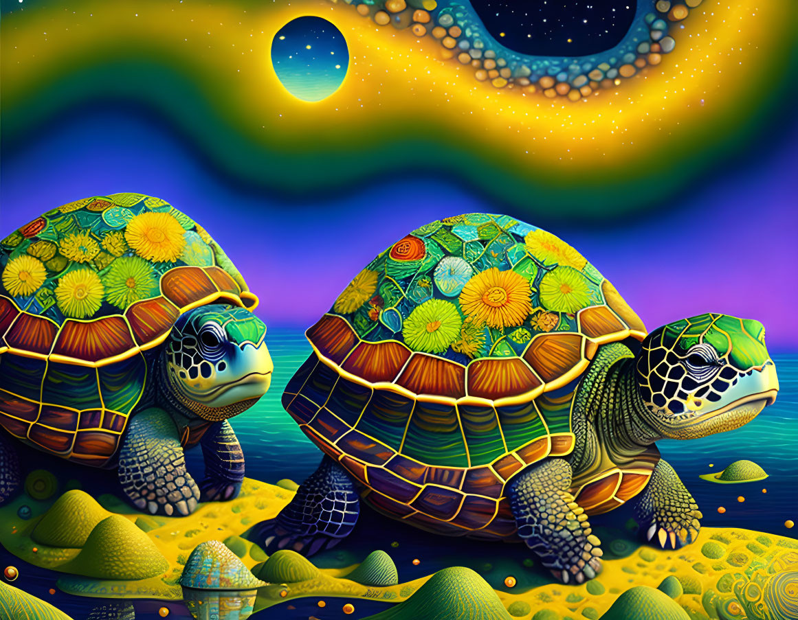 Colorful Turtle Illustration with Floral Shells Under Crescent Moon
