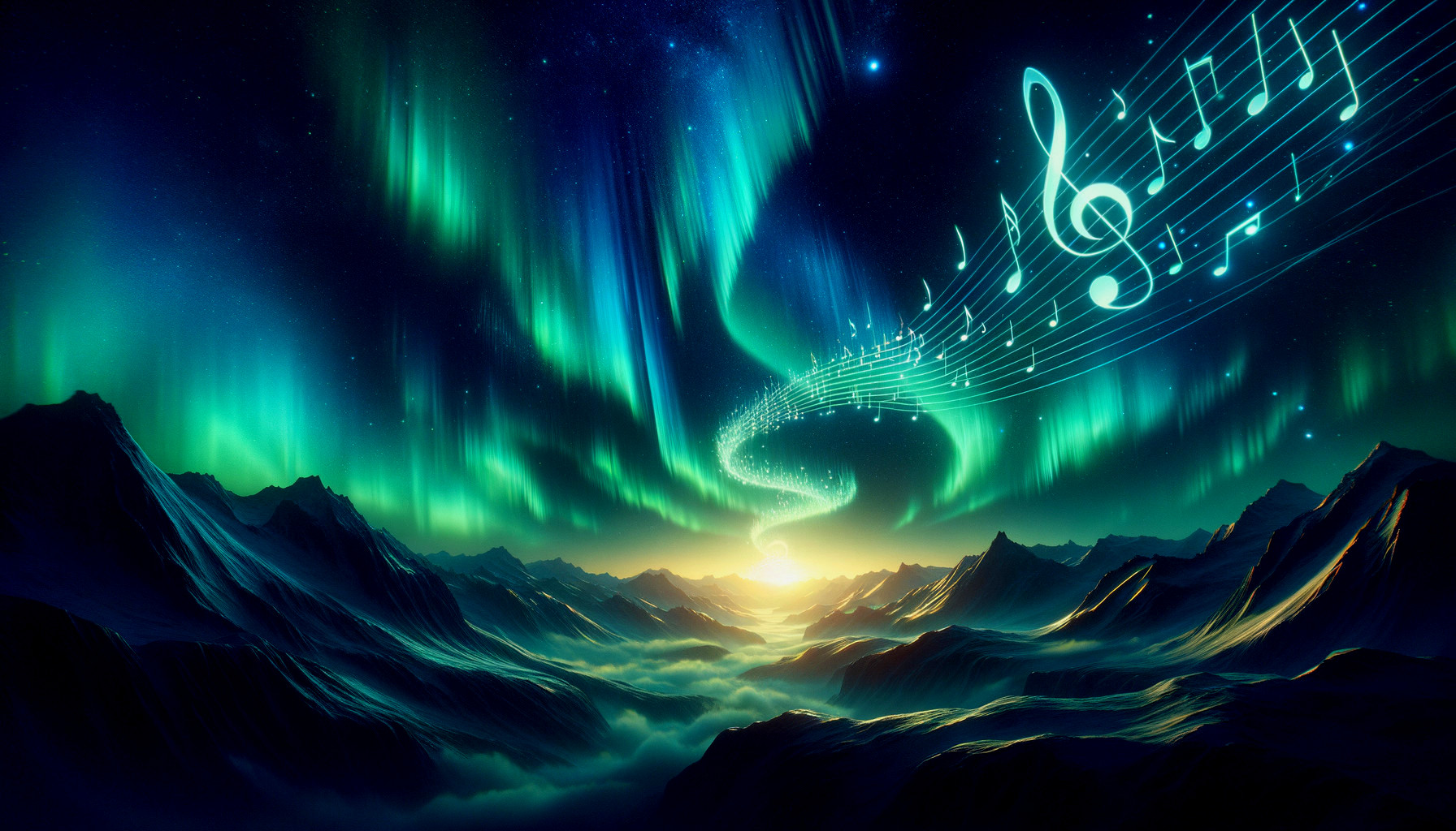 A vibrant digital artwork featuring northern lights with musical notes flowing over snow-capped mountains under a starry sky.