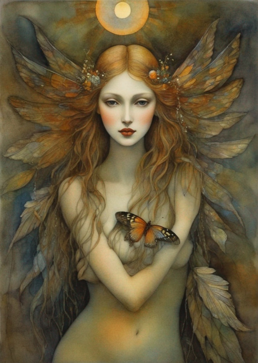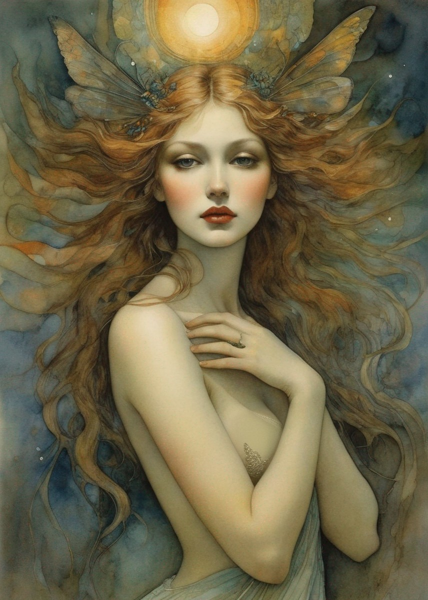 A portrait of a woman with flowing red hair, fair skin, a golden halo, and a mosaic background, evoking a Pre-Raphaelite or classical style.