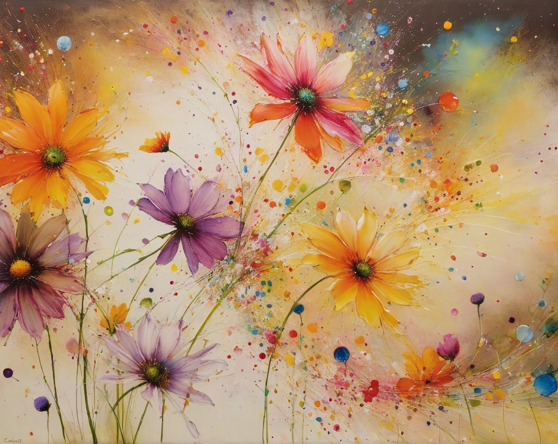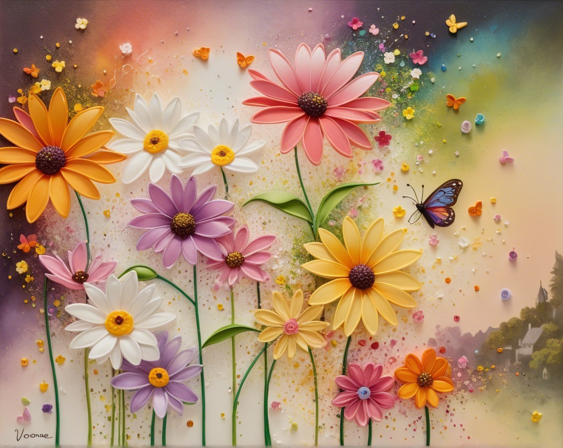 A mixed-media artwork featuring colorful flowers in shades of pink, purple, orange, and yellow, with butterflies.