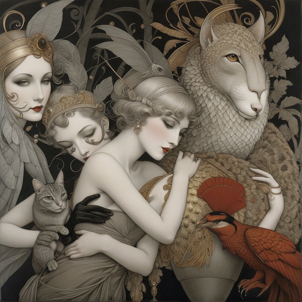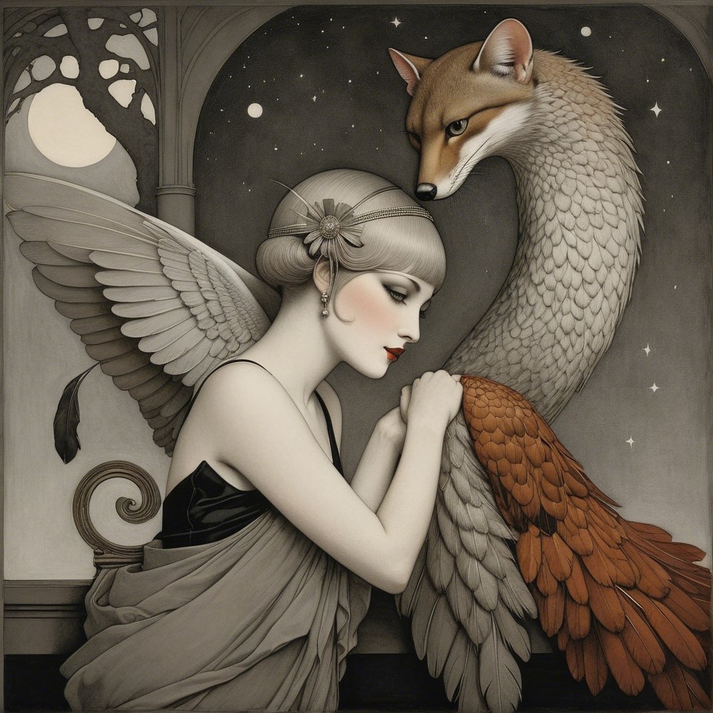The image depicts a woman with angelic wings, styled in vintage fashion, gazing thoughtfully while a majestic fox with orange and white fur intertwines with her, creating a mystical connection.